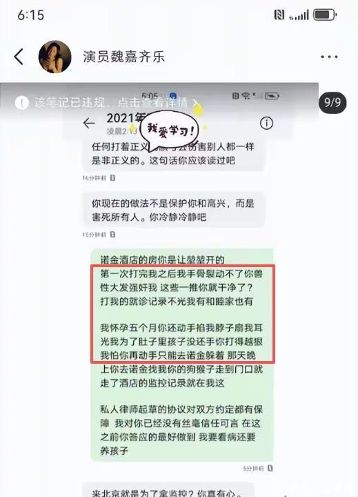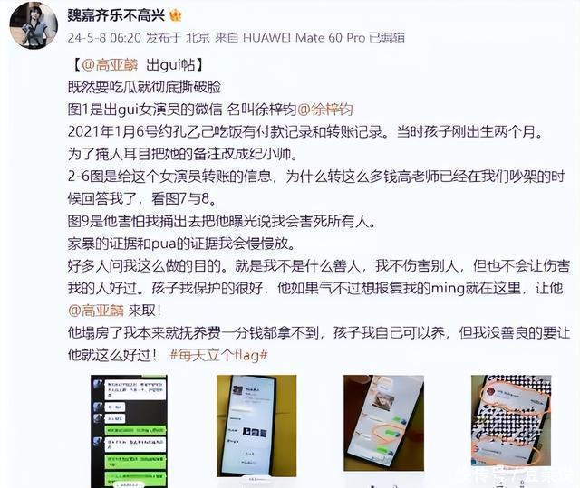 那年5月,演员魏嘉公开爆料,说自己和高亚麟有个三岁的私生女,且两人没领证。更让人震惊的是,她怀二胎五个月时,高亚麟不仅出轨小26岁的女演员徐梓钧,还对她家暴。 魏嘉晒出证据,说高亚麟掐她脖子、扇耳光,把她的手打到骨裂,事后又下跪求原谅,甚至用跳楼威胁她。