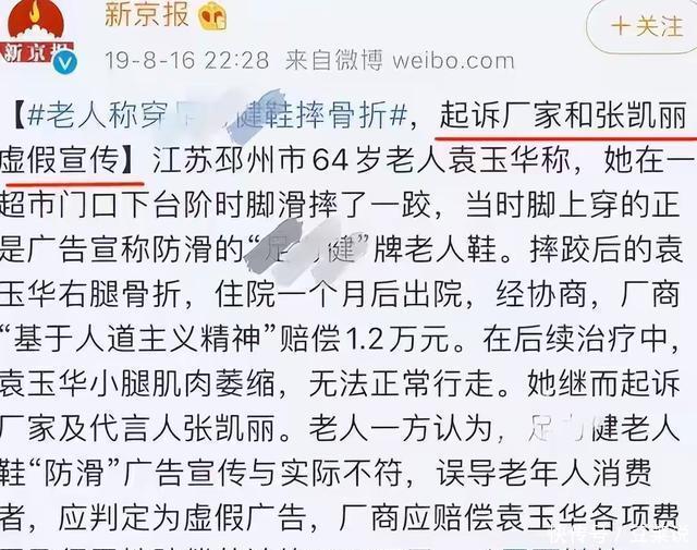 2019年,江苏一位64岁的老人袁玉华,就因为穿这款鞋在下台阶时滑倒,摔成了右腿骨折。老人家属找厂商协商,对方只给了1.2万元人道主义赔偿,还要求保密。 家属气不过,把厂商和张凯丽一起告上了法庭,说广告是虚假宣传,误导消费者。虽然法院没直接判张凯丽有责任,中广联也澄清她没参与品牌经营,但公众的质疑没停。