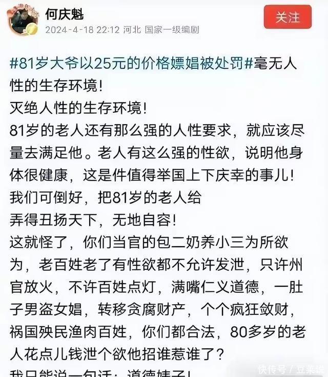 更离谱的是, 他还曾为“81岁大爷嫖娼被处罚”发声,试图合理化这种违法行为,引发一片骂声,让人看清他“有才无德”的真面目。